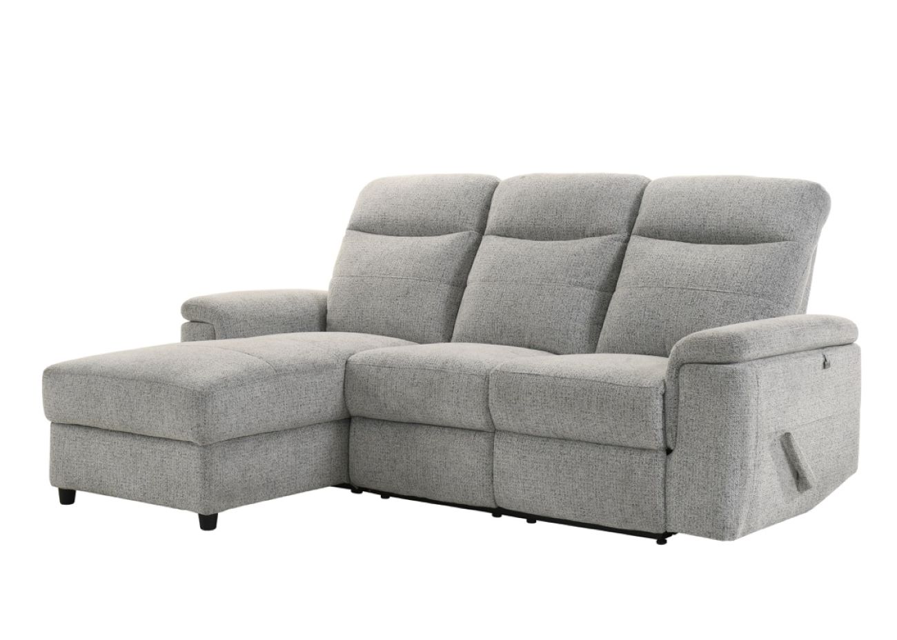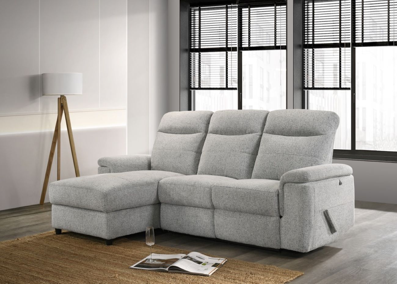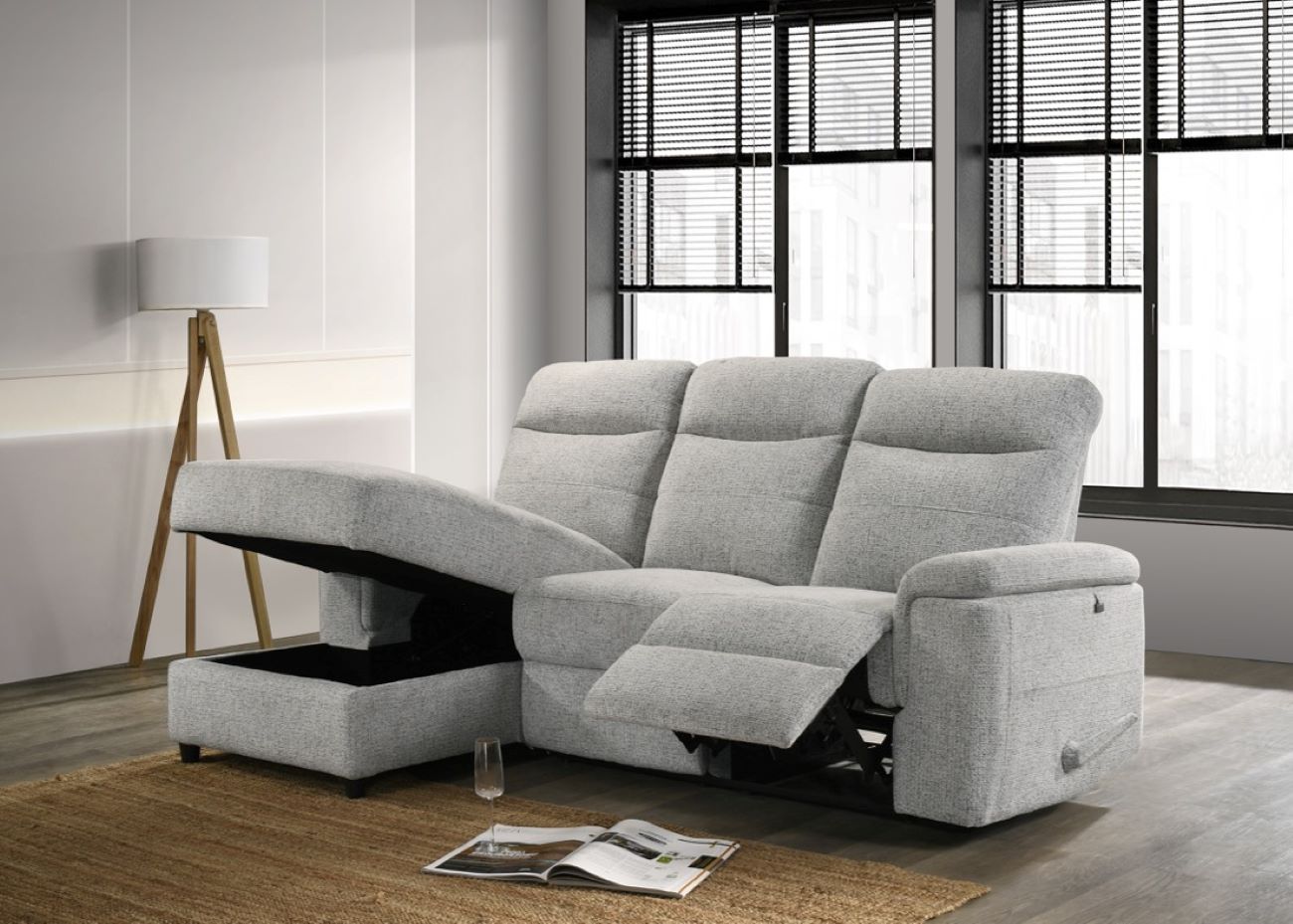 Designed and assembled in Canada, this reclining sofa with lounge chair and storage compartment combines comfort and functionality.