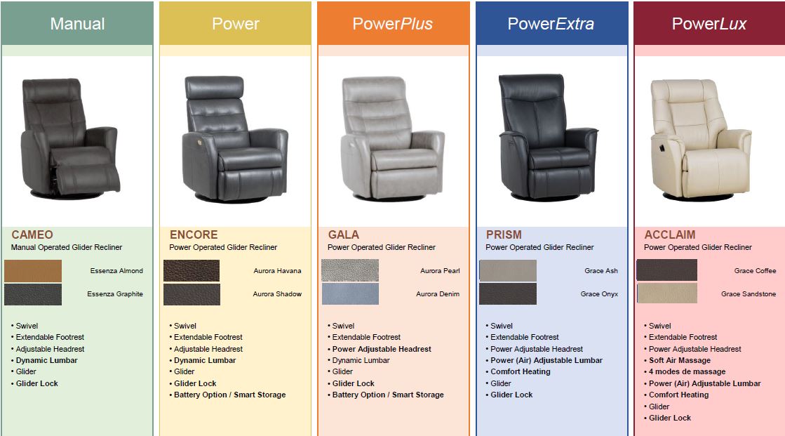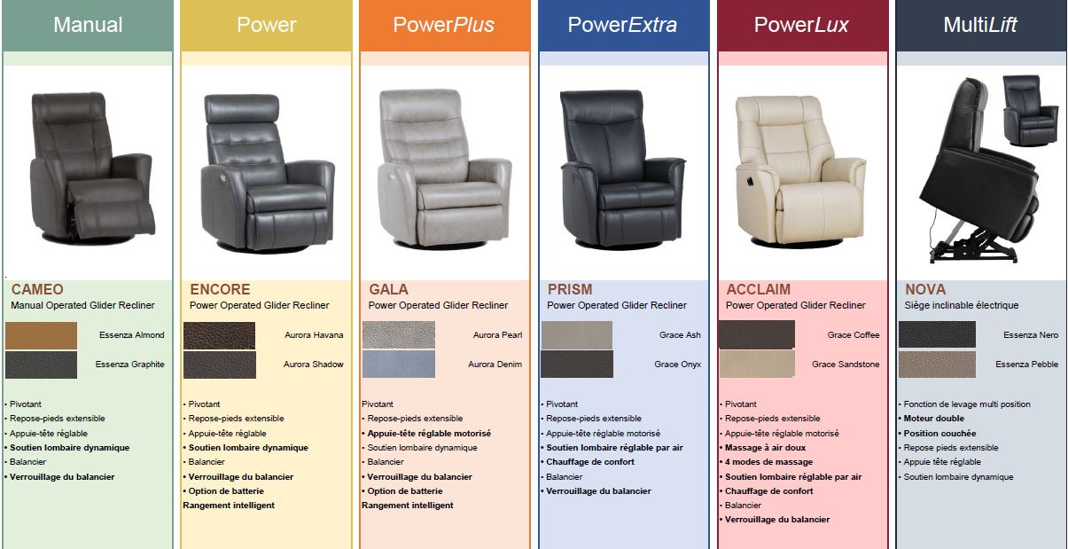 6 models of Norwegian-designed reclining armchair, offering high quality comfort seating.